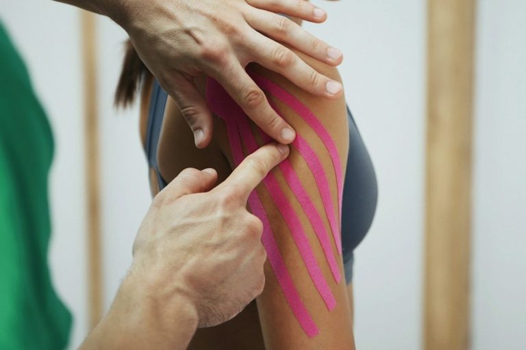 Durch das Anbringen von elastischen Bändern auf der Haut kann die Durchblutung verbessert, Schmerzen gelindert und die Beweglichkeit der Gelenke gefördert werden.